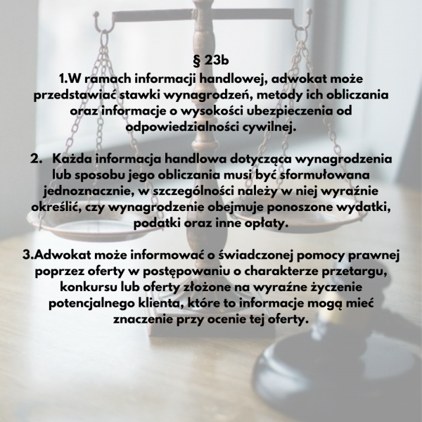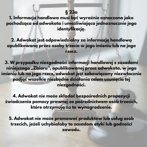 W Polsce, podobnie jak w wielu innych krajach, prawników obowiązuje ścisły kodeks etyki zawodowej, który określa pewne zasady postępowania i reguluje działalność reklamową. W ramach tego kodeksu wprowadzono zakaz zamieszczania informacji o cenach usług prawnika, a także oświadczeń gwarantujących powodzenie sprawy lub obiecujących określony wynik.
